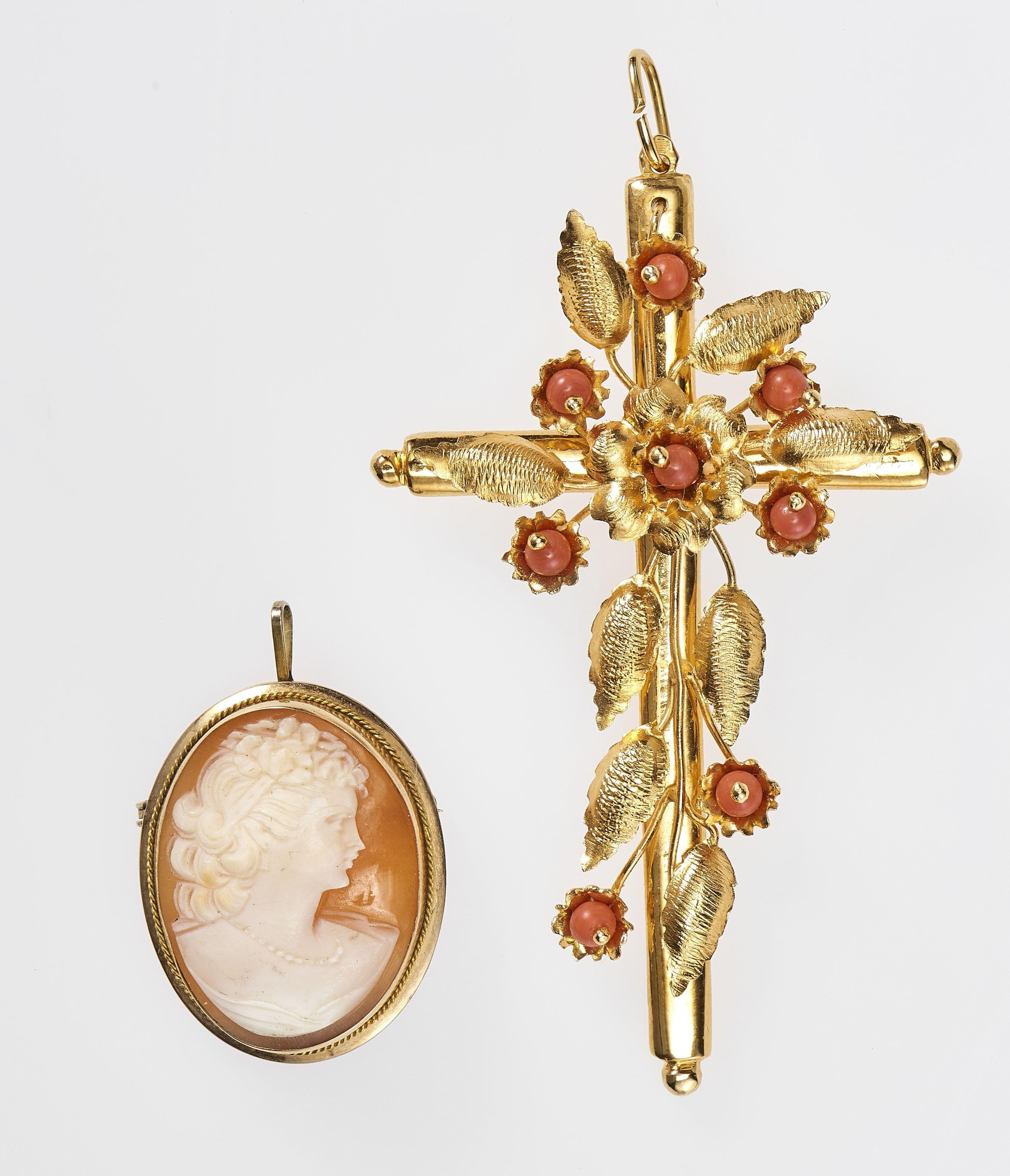 Or et or gris 750, H 6,5 et 7 cm, poids brut 6 g. Provenance: co...