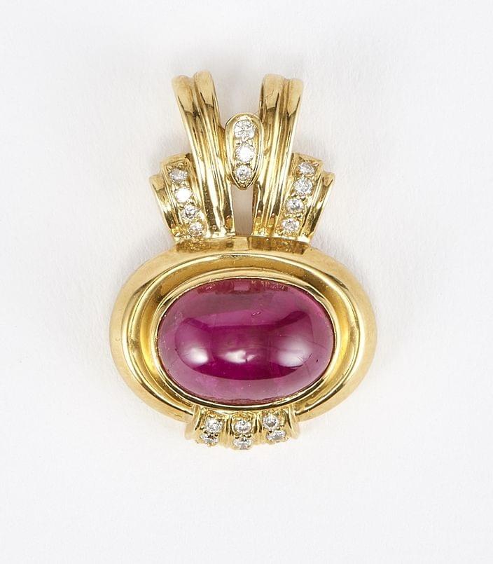 3323. Pendentif serti d'un rubis taille cabochon (env. 4 ct) rehaussé de diamants