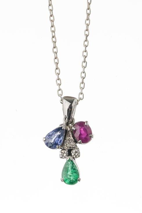 3125. Pendentif serti d'une émeraude, d'un saphir et d'un rubis rehaussés de diamants