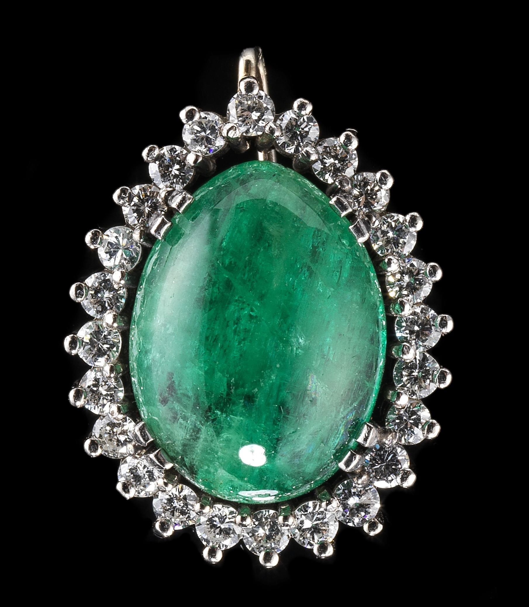 87. Pendentif serti d'une émeraude taille cabochon poire (env. 17,4x12,9 mm) entourée de diamants (env. 0,7 ct)
