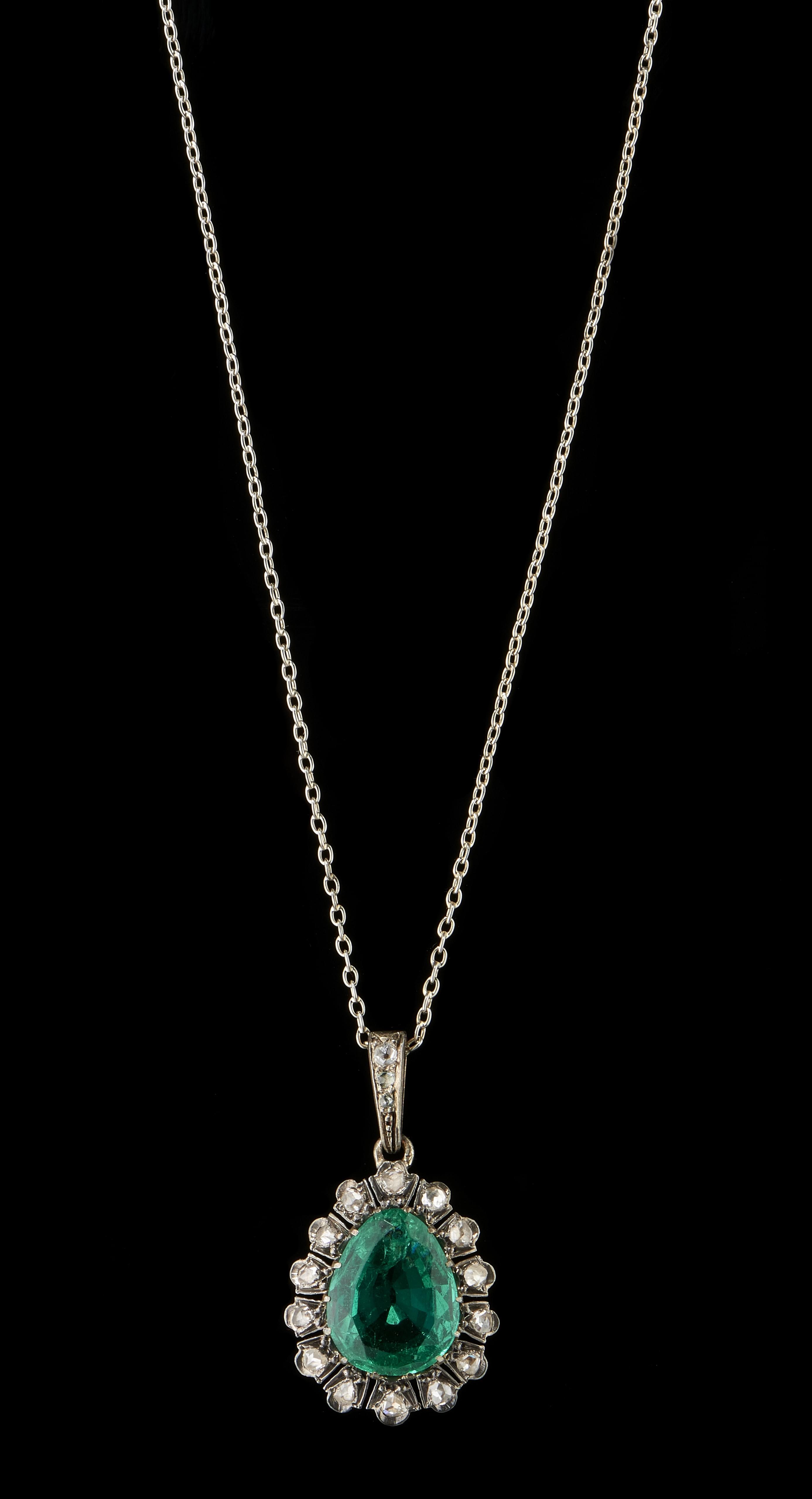 973. Pendentif serti d'une émeraude taille poire (env. 3 ct) entourée de roses de diamants