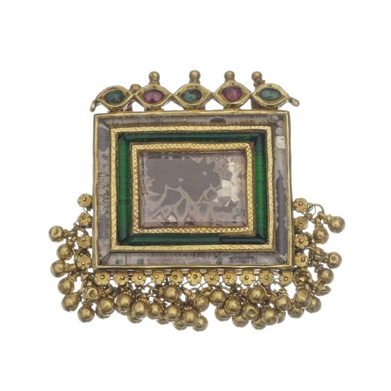 265. Pendentif serti d'une plaque de cristal de roche entourée de baguettes de verre imitant l'émeraude et surmontée d'émeraudes et de rubis en cabochon, l'ensemble retenant de nombreuses pendeloques