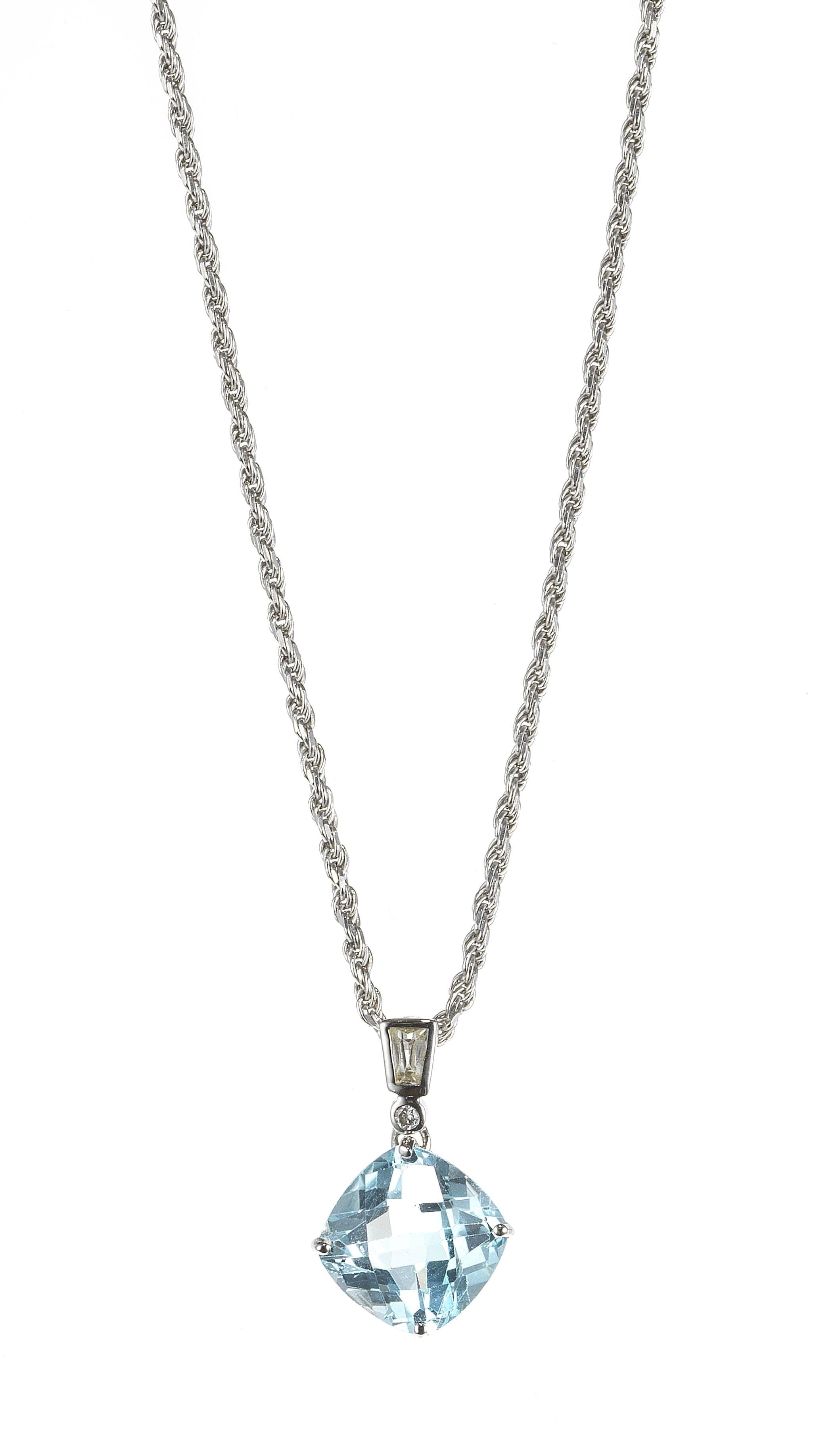 3151. *Pendentif serti d'une topaze bleue facettée rehaussée d'un diamant et d'un saphir blanc