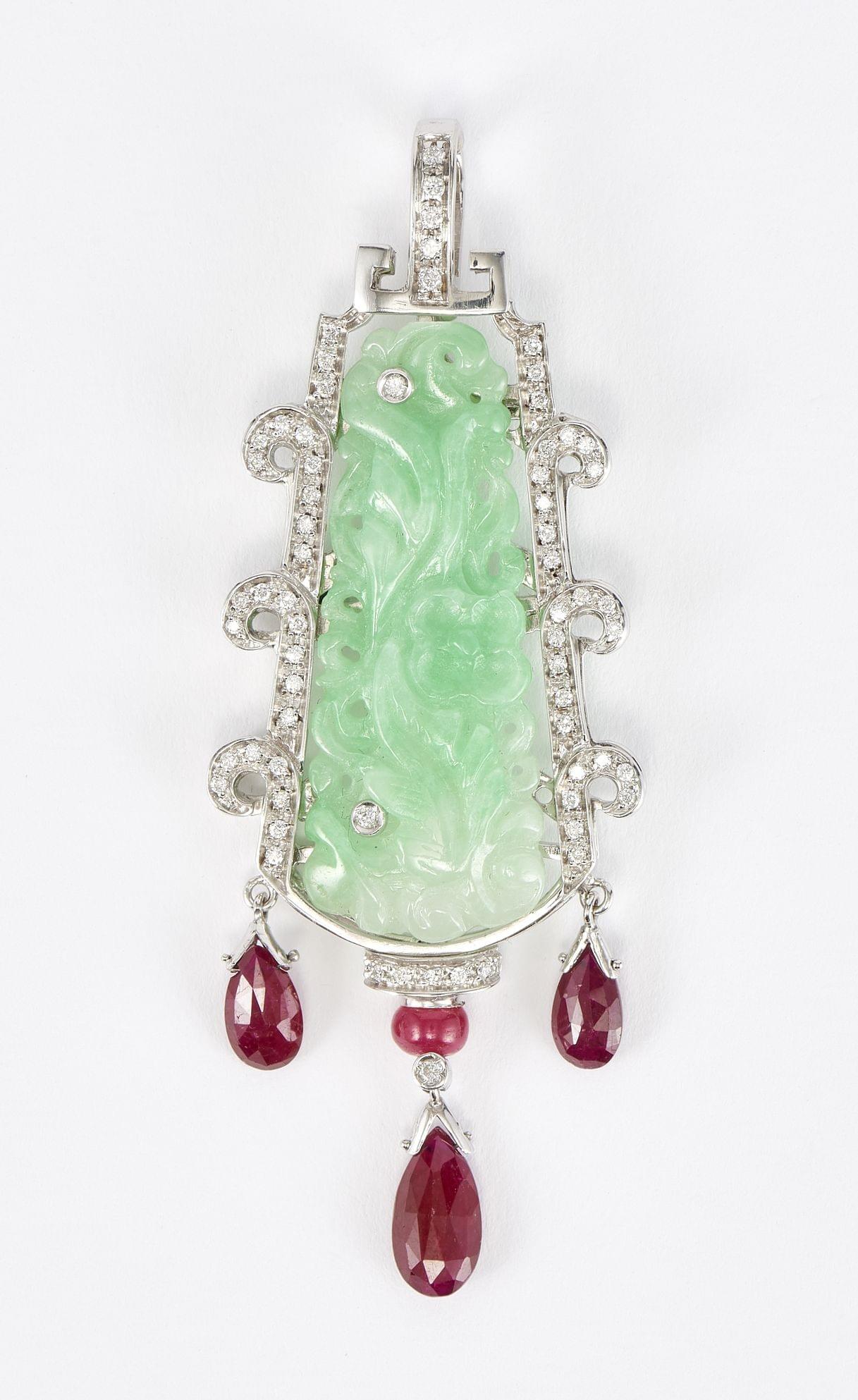3359. Pendentif sertie d'une plaque de jade ajouré et sculpté entourée de diamants et retenant des pendeloques de rubis
