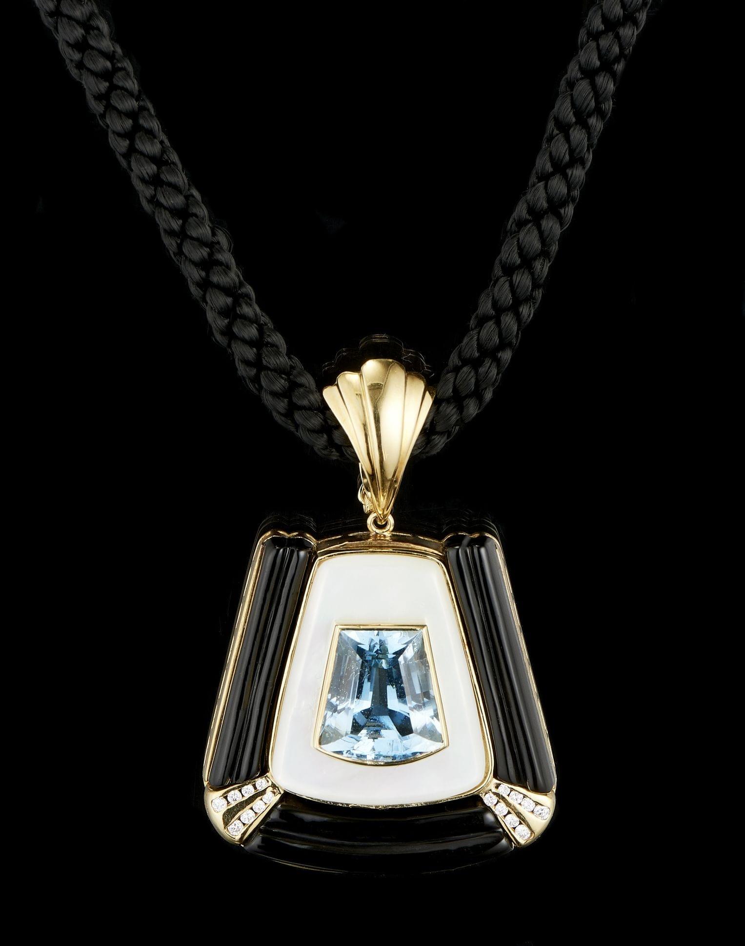 149. Pendentif sur cordon serti d'une topaze bleue taille fantaisie entourée de nacre, d'onyx et rehaussée de diamants