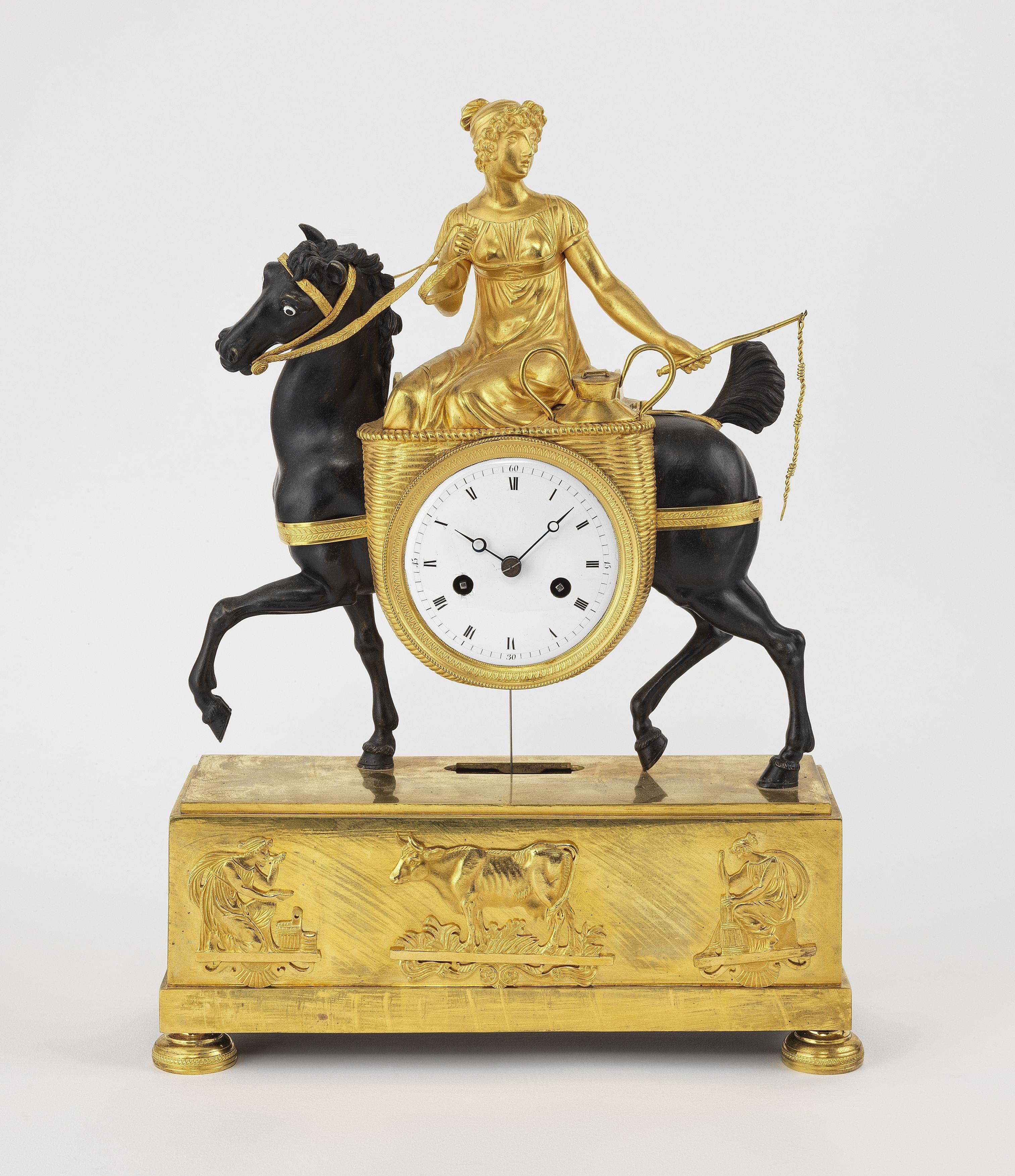 Figurant une jeune femme montée sur un cheval, bronze doré et bronze patiné, cadran émaillé blanc, H 40 cm. Un modèle similaire illustré dans : Kjellberg Pierre, Encyclopédie de la pendule française, Les éditions de l'amateur, Paris, 1997. p. 433, ill. G
