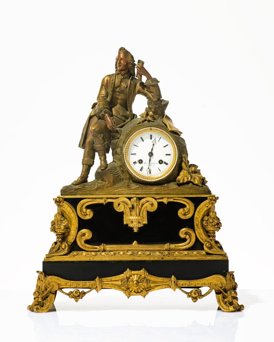 Bronze à patine brune, bronze doré et marbre noir, cadran émaillé blanc signé Mamet Cadet à Macon, surmontée d'une figure du poète Legouve, 48x38x15 cm