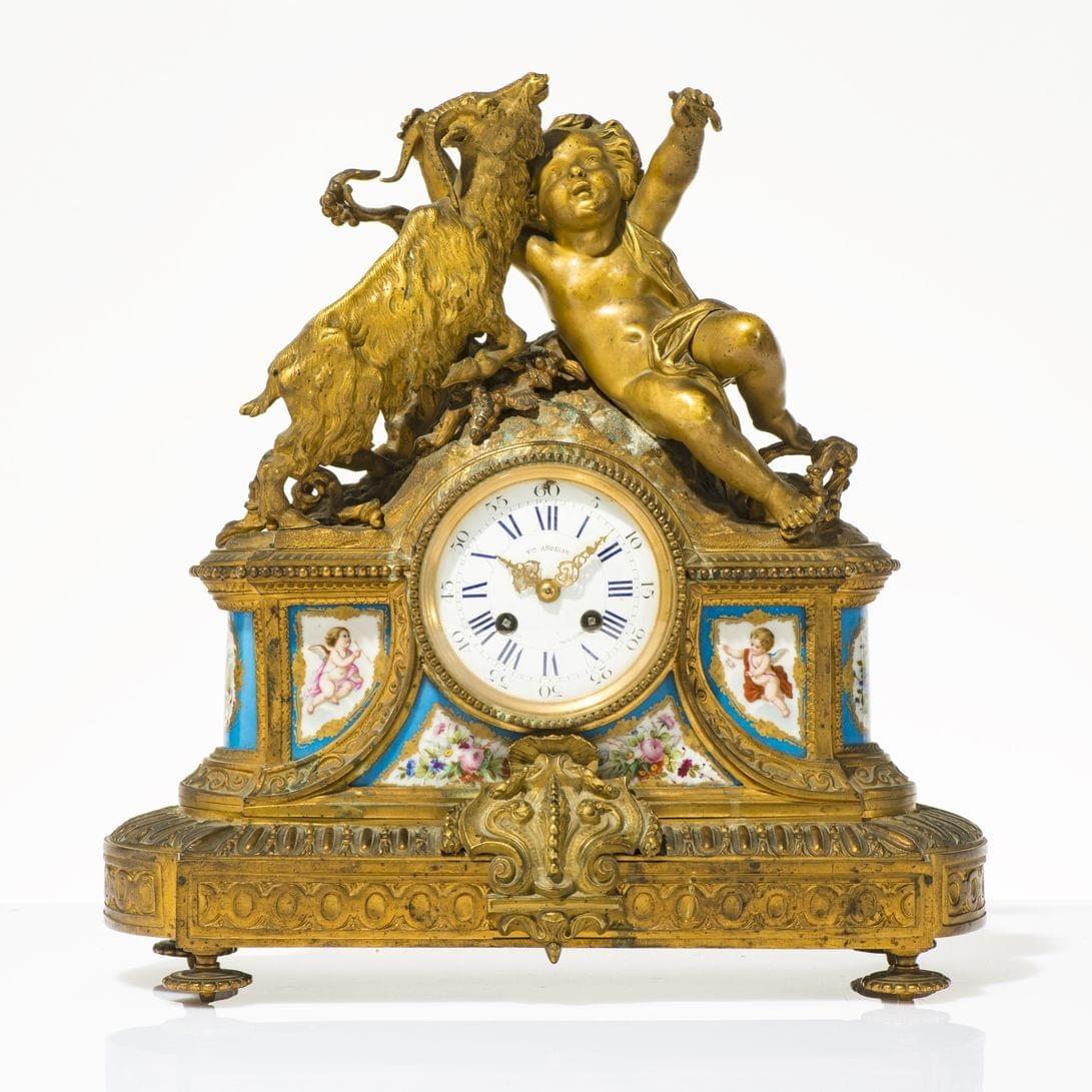 Cadran émaillé blanc signé Victor Asselin au Palais Royal, bronze et régule dorés, plaques de porcelaine à décor polychrome de putti et fleurs