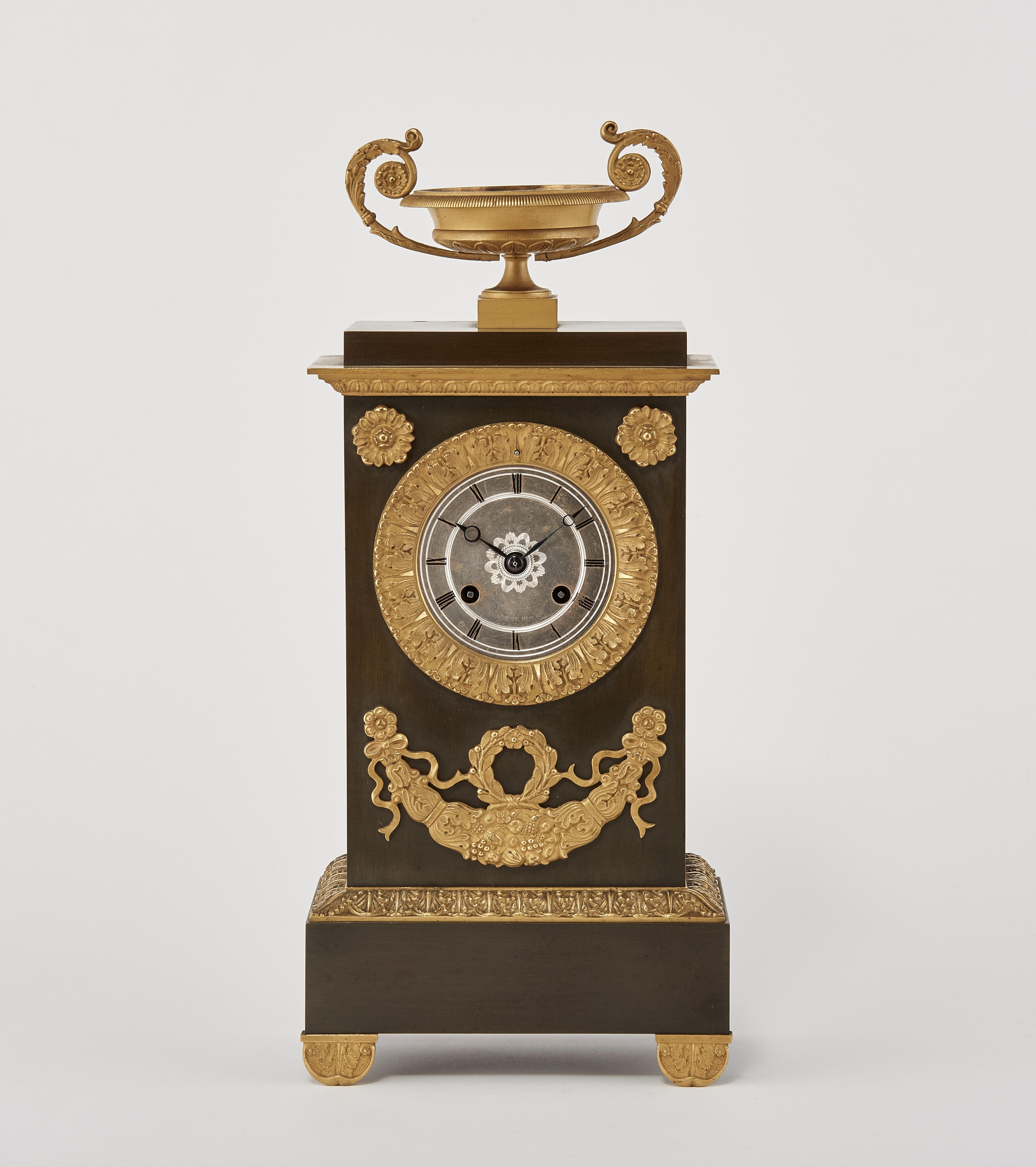 Cadran émaillé blanc, bronze doré et patiné, H 39 cm