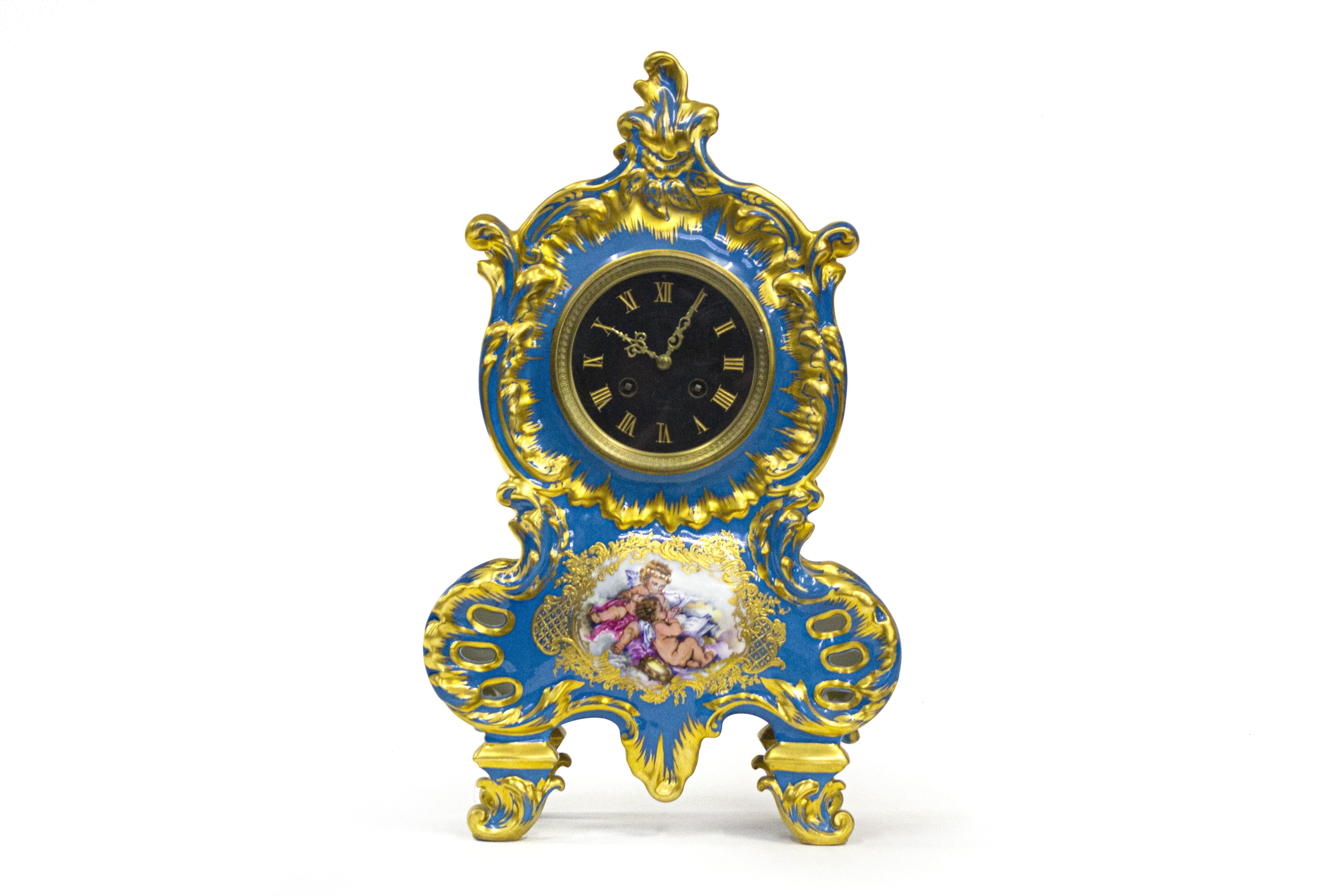 3969. Pendule de style Louis XV bleue et or à décor en réserves de scènes galantes, cadran émaillé noir