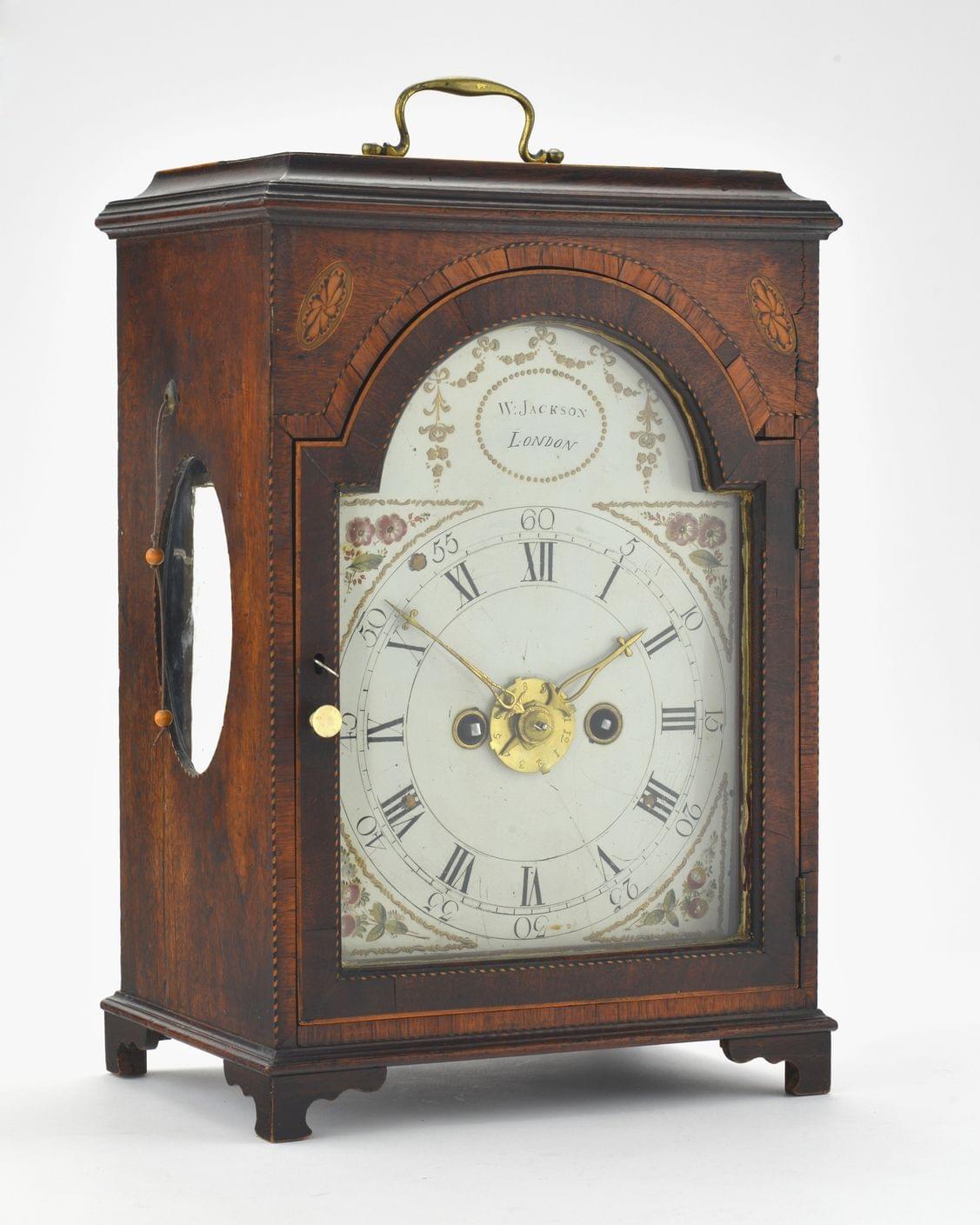 Londres, W. Jackson, acajou, cadran émaillé à décor de fleurs, mouvement fusée et déclencheur d'alarme, H 42 cm