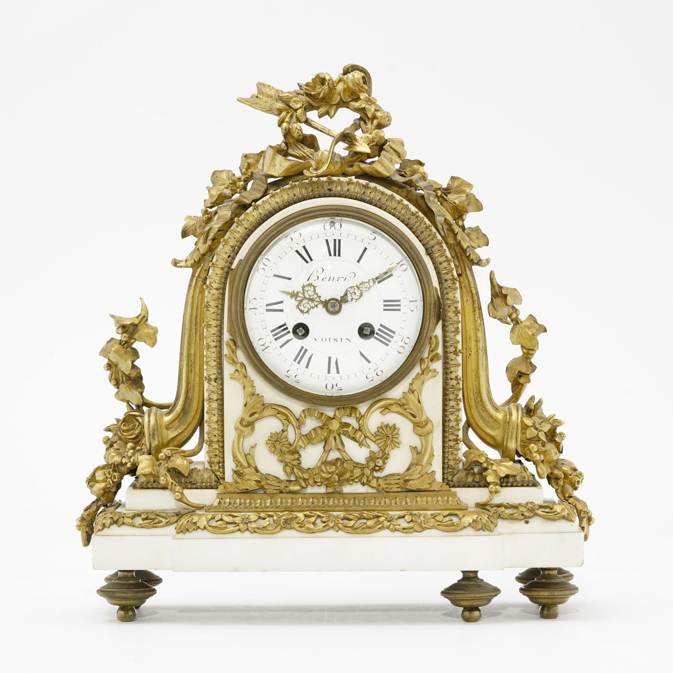 Bronze patiné et doré, marbre blanc, cadran émaillé blanc, H 29 cm