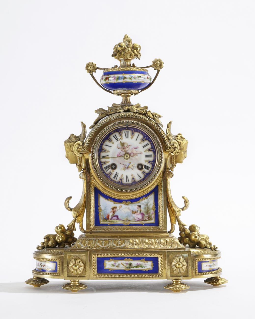 Bronze doré et plaques de porcelaine émaillée à décor d'un putto et de deux enfants, H 38 cm