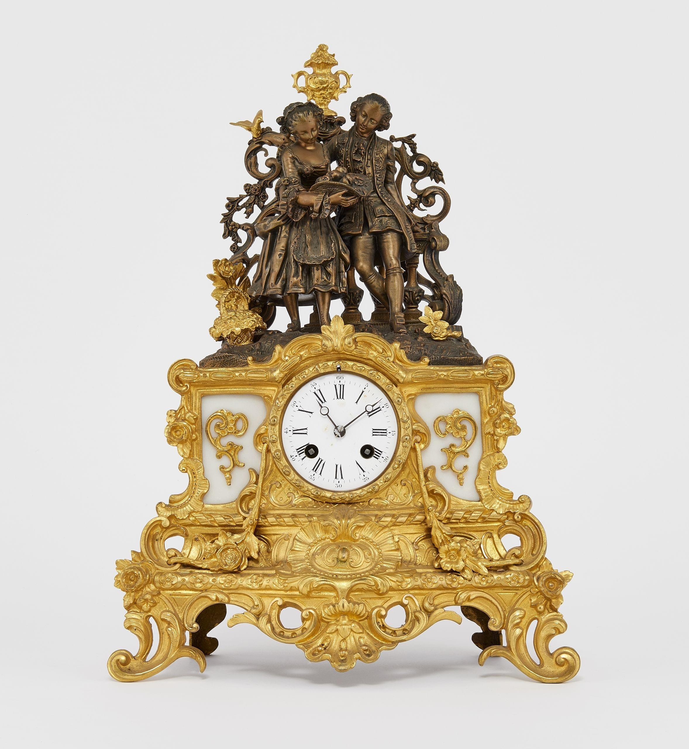 A décor d'un couple galant, bronze patiné et doré, marbre blanc, cadran émaillé blanc, H 43 cm.