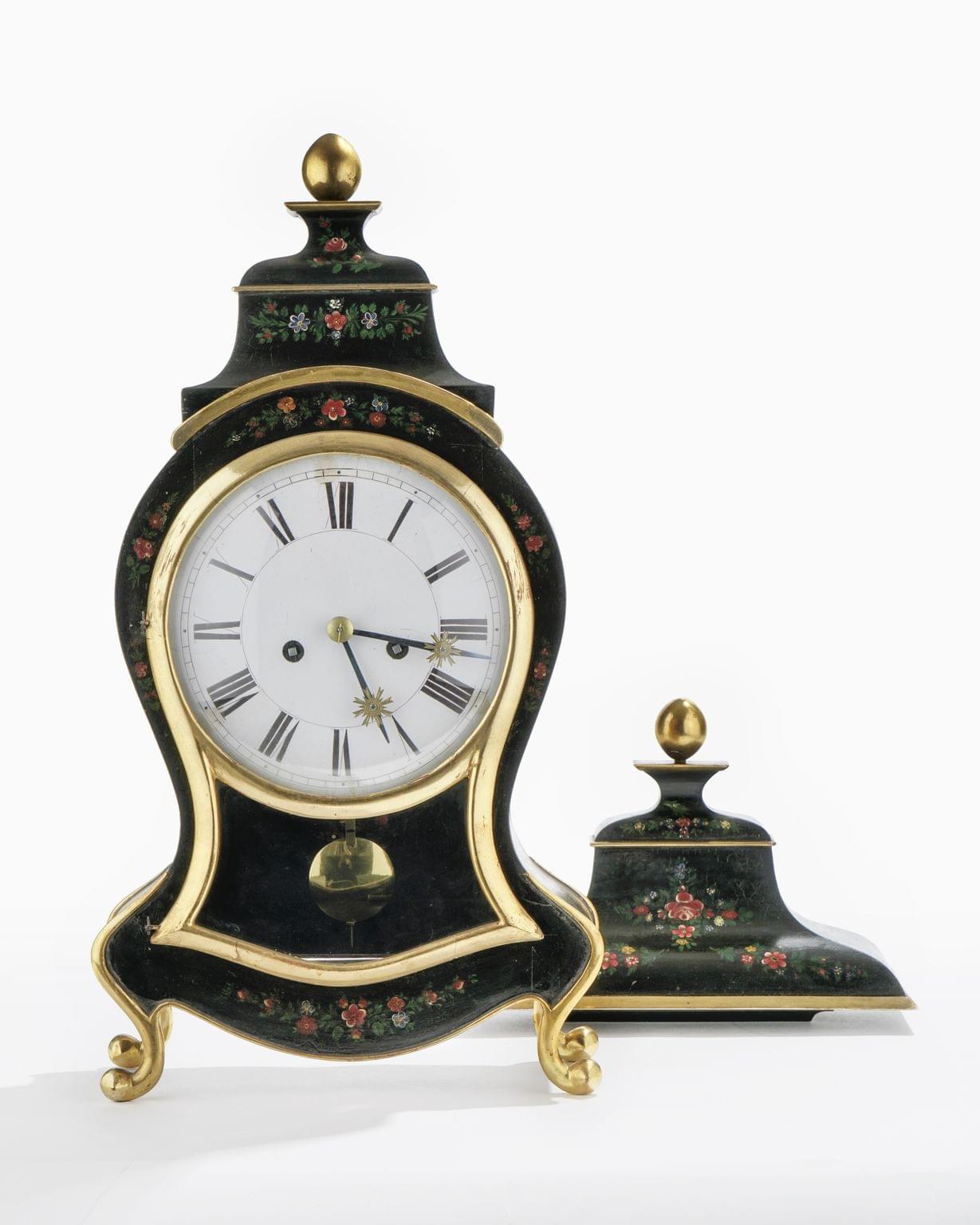 Bois laqué noir et or à décor peint de fleurs, cadran en émail blanc, H 70 cm