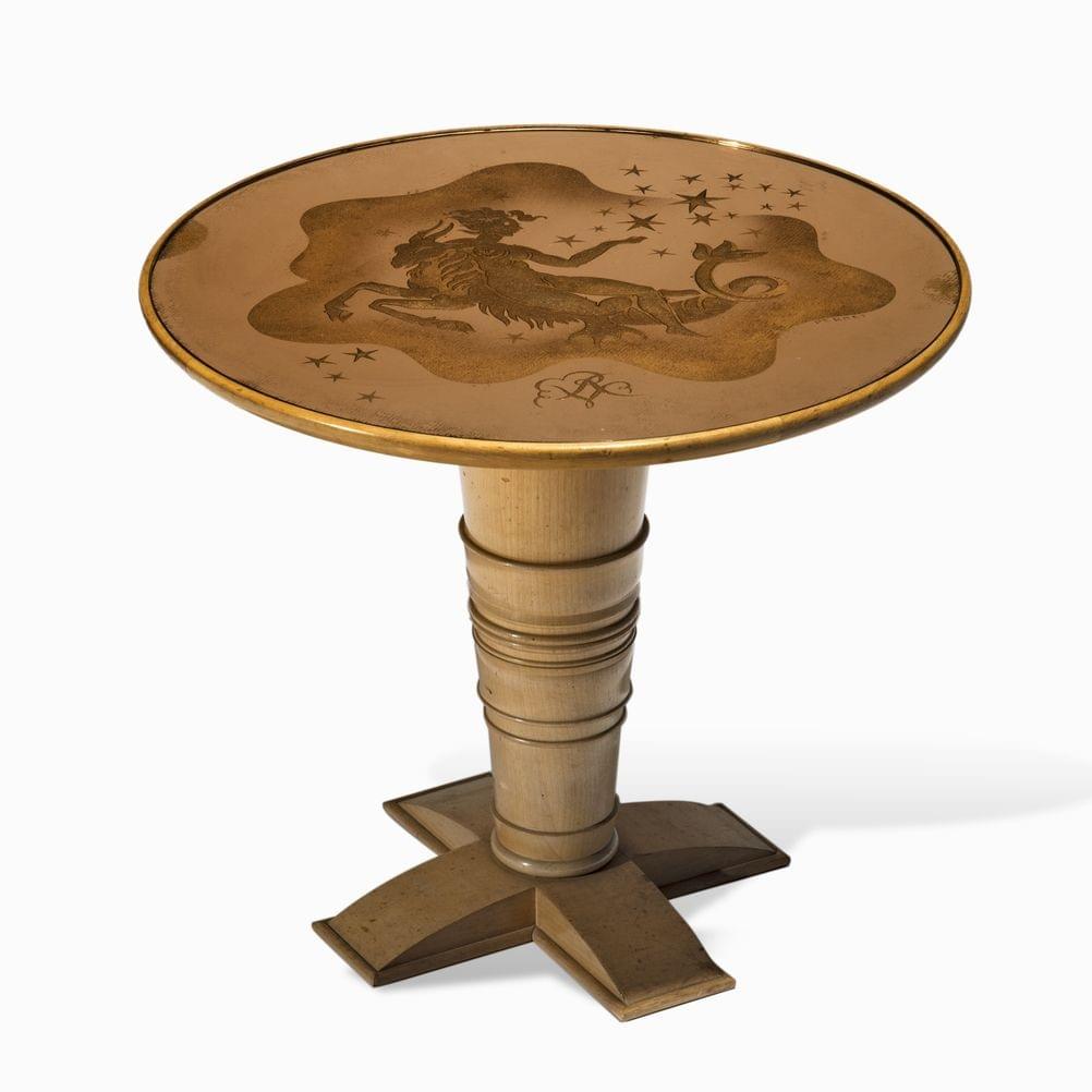 Guéridon rond, plateau de verre églomisé à décor du Capricorne, 56x65 cm