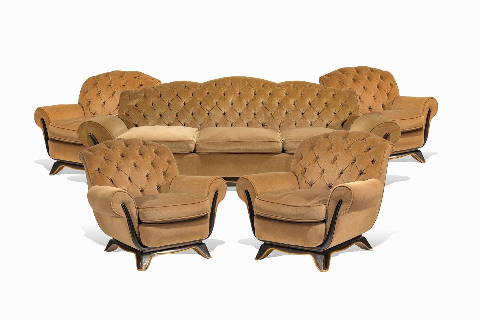 Salon comprenant un canapé et quatre fauteuils club, bois noirci et moulure de bois clair