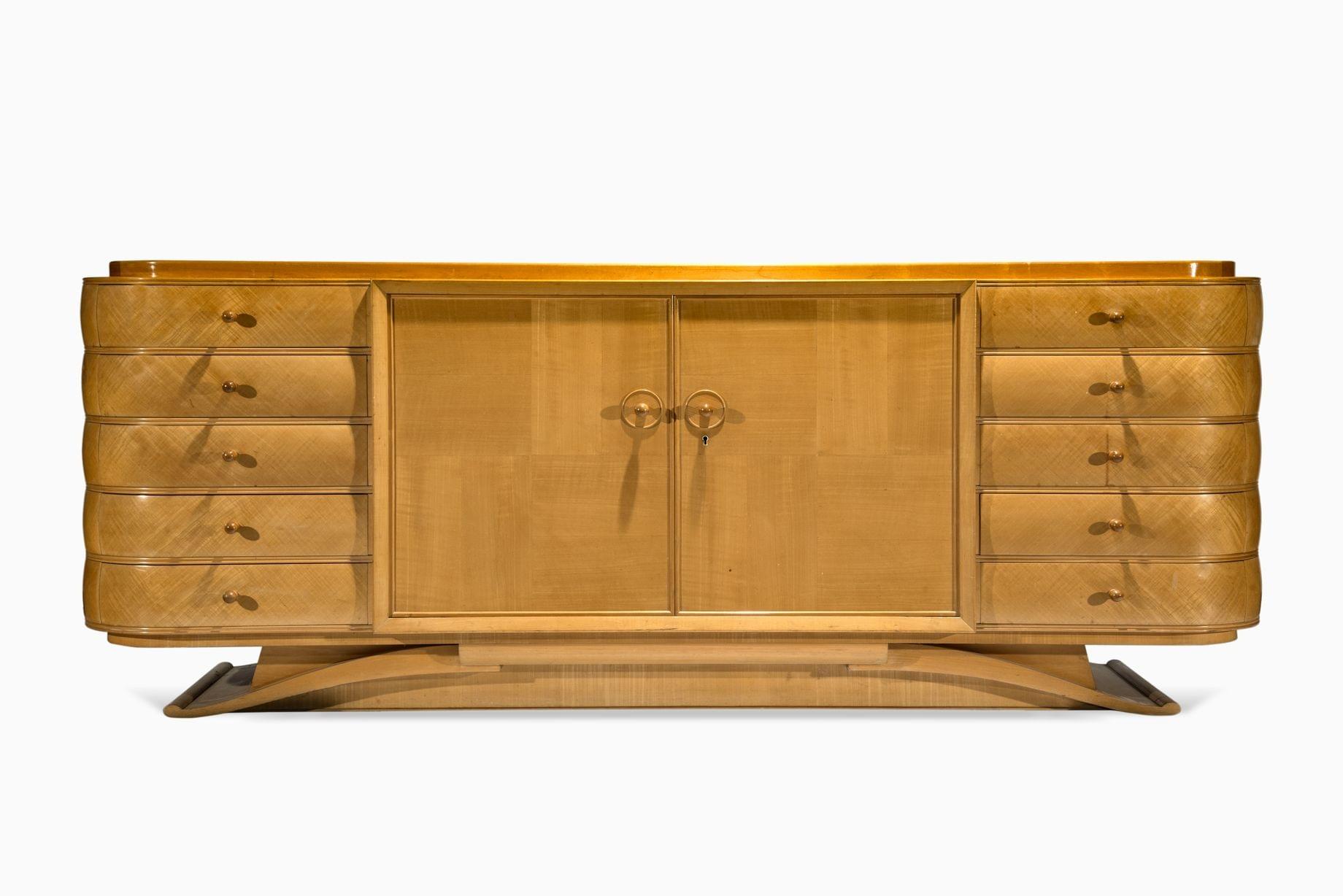 Enfilade à façade droite, dix tiroirs, deux vantaux, placage de sycomore, 91x230x58 cm