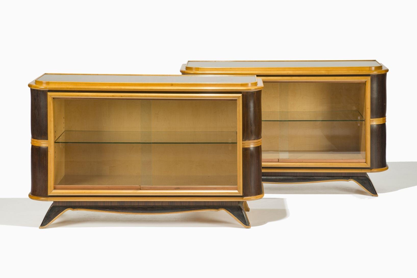 Paire de petits buffets vitrés, palissandre et bois clair, 87x143x84 cm