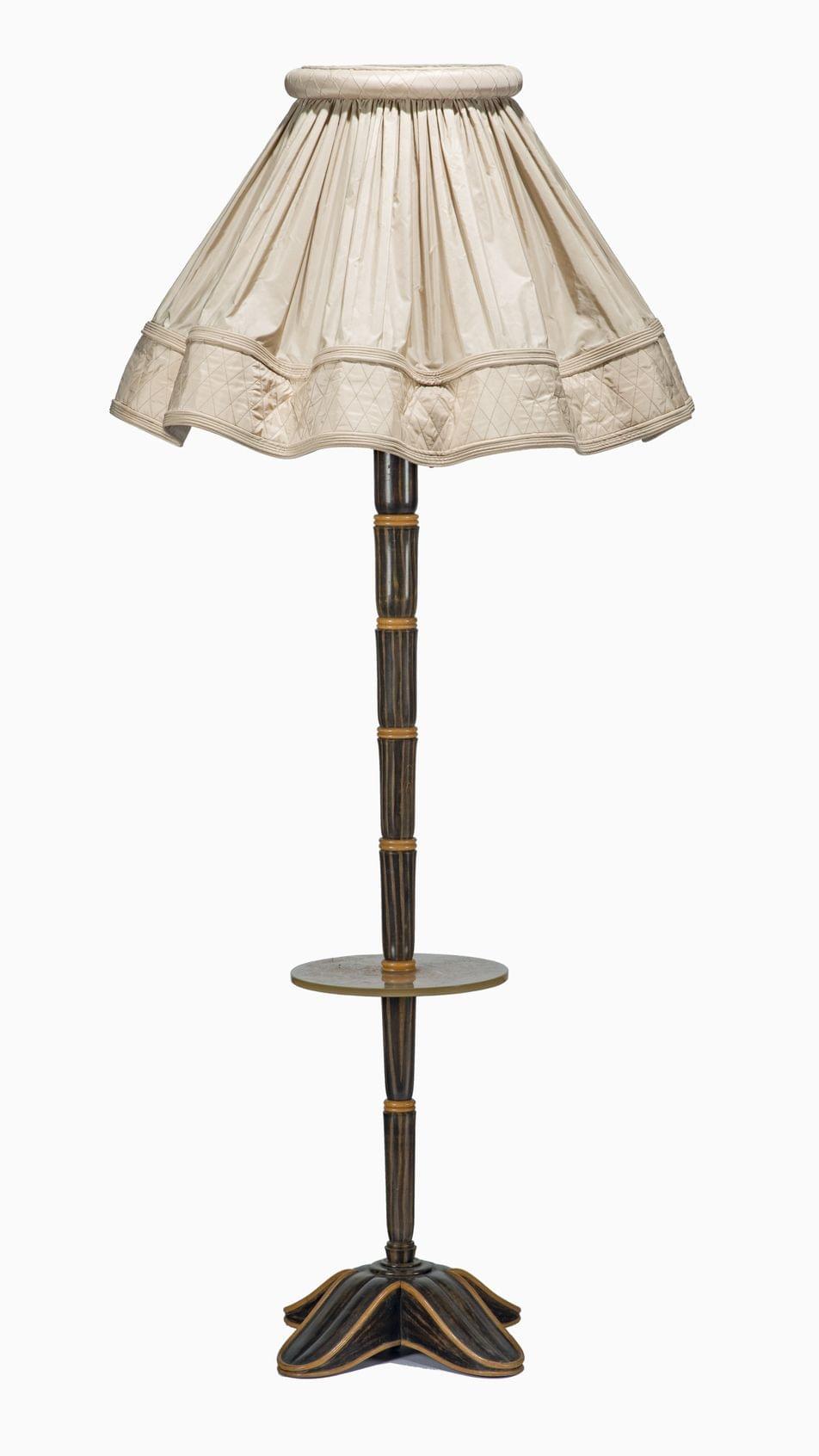 Lampe de parquet à quatre pieds, fût bagué à plateau central, bo...