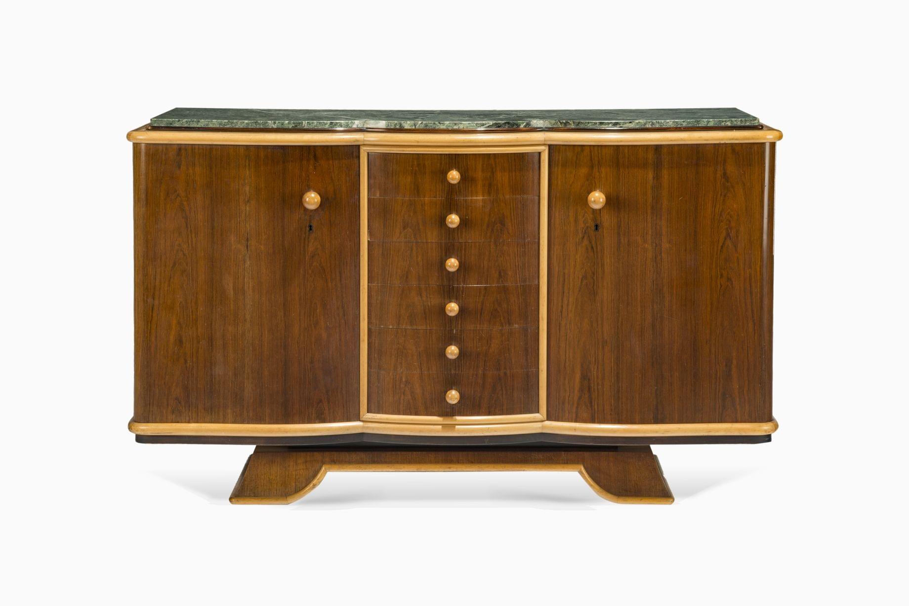 Petit buffet, deux vantaux et six tiroirs centraux, palissandre et moulures de bois clair, marbre veiné vert, 86x143x44 cm