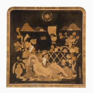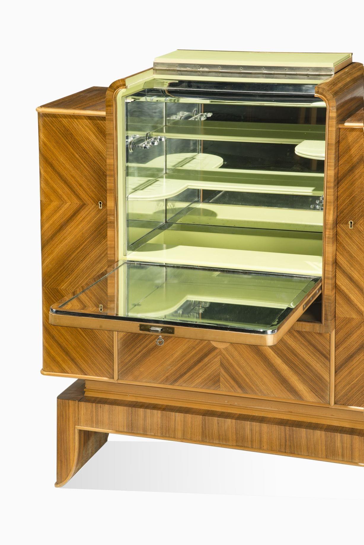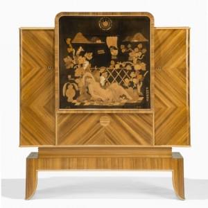 Meuble bar, abattant central à décor marqueté de Pomone, deux vantaux latéraux et un tiroir, bois de placage, palissandre et bois clair et galuchat, 115x108x45 cm
