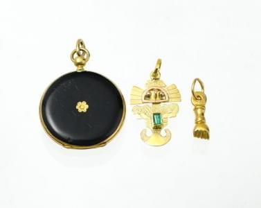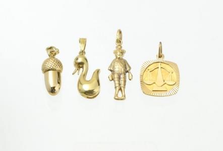 3141. Lot de quatre pendentifs figurant un cygne, un gland, un personn...