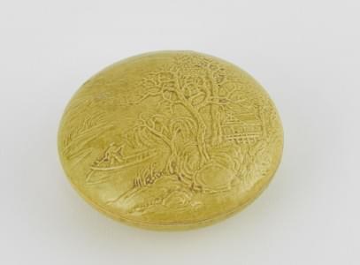 Bois fruitier à décor peint d'une ville surréaliste, porte un mo...