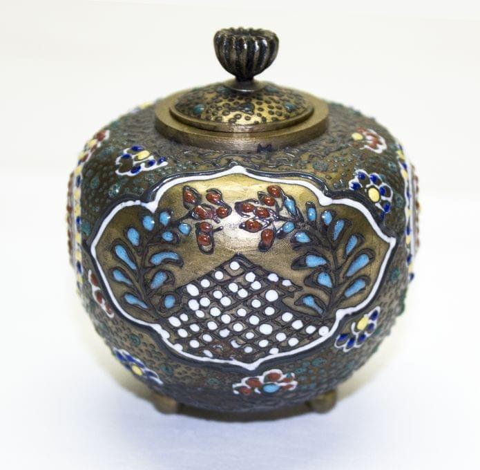 123. Petit Kovsh à décor de fleurs et volutes en émaux cloisonnés