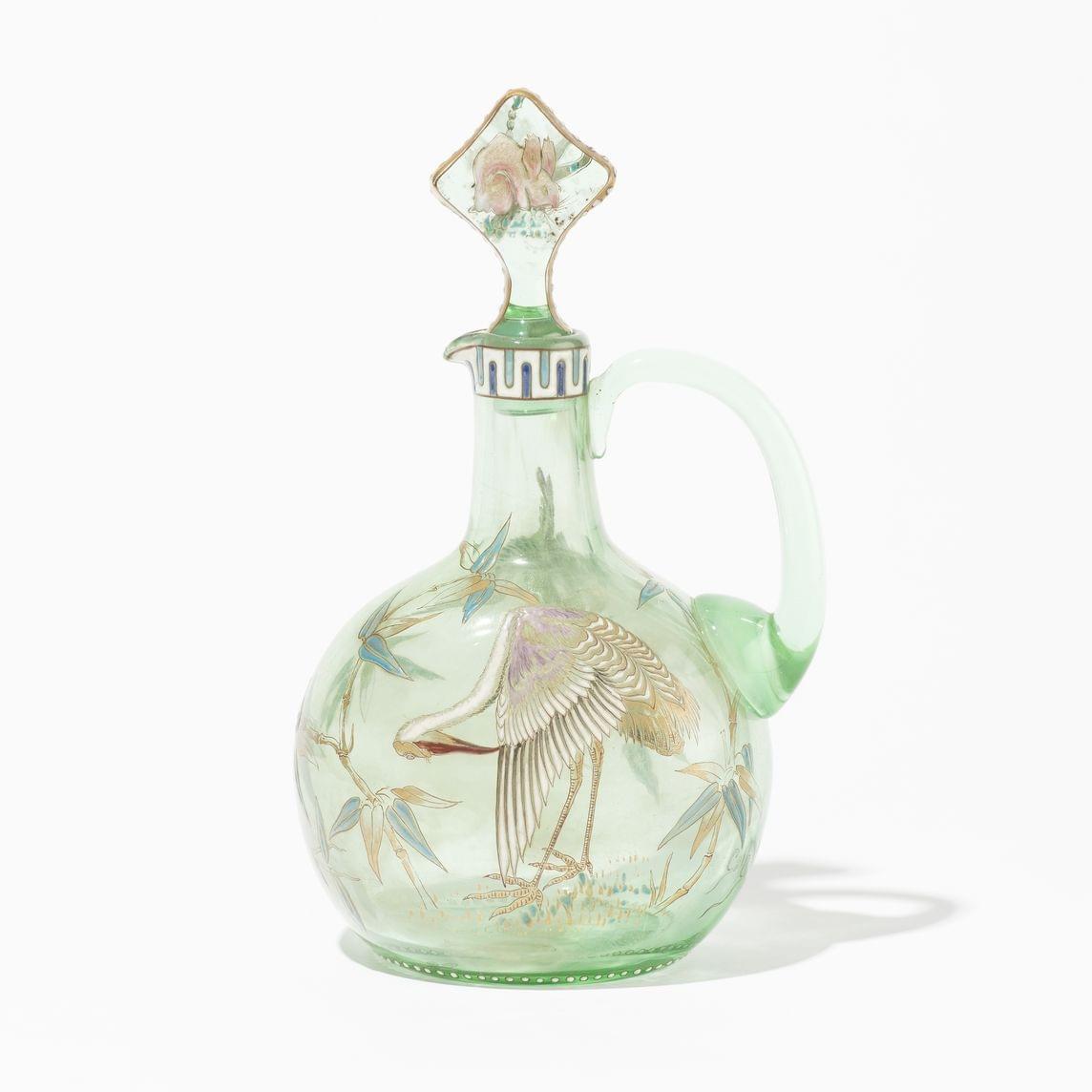 Verre à décor émaillé et doré figurant des animaux dont échassiers, libellules et lapins. Inscrit sous la base "Réedité en sa cristallerie de Nancy, expos 1900" et étiquette de la manufacture