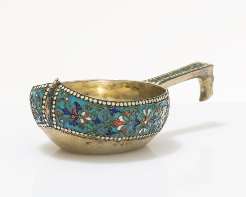 123. Petit Kovsh à décor de fleurs et volutes en émaux cloisonnés