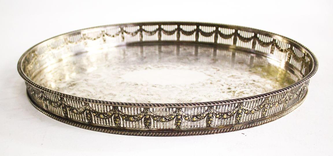 3150. Petit plateau de service ovale gravé de rinceaux à bordure ajourée