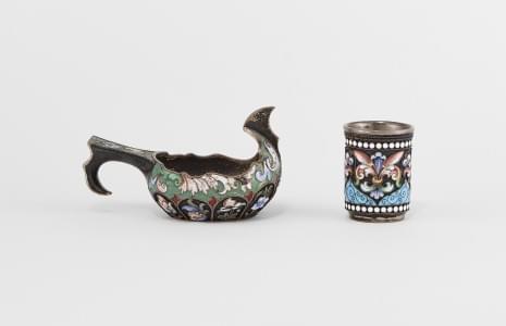 582. Petit kovsh et gobelet à vodka émaillé de rinceaux
