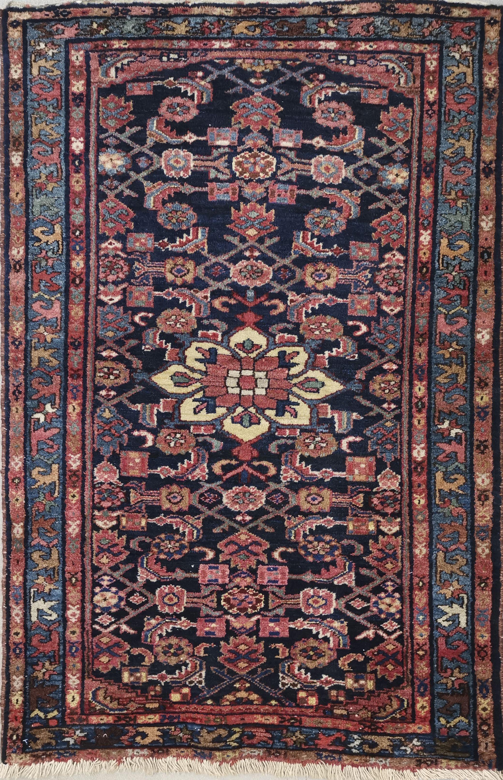 Laine à motif d'un fleuron central beige sur fond bleu nuit, 126x83 cm.