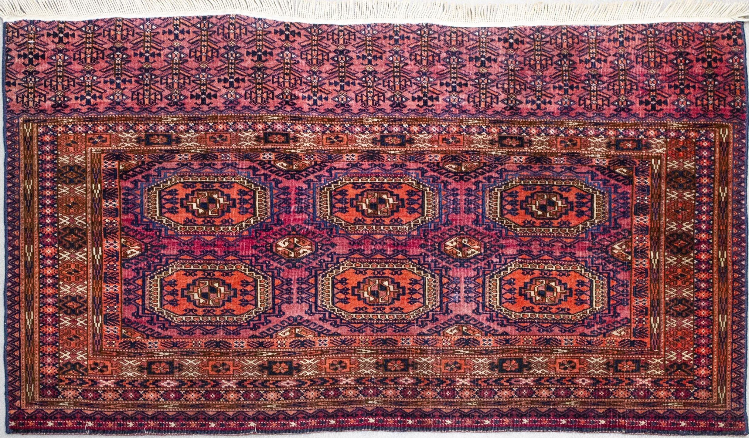 Soie à motifs géométriques et stylisés sur fond violet, 70x122 cm
