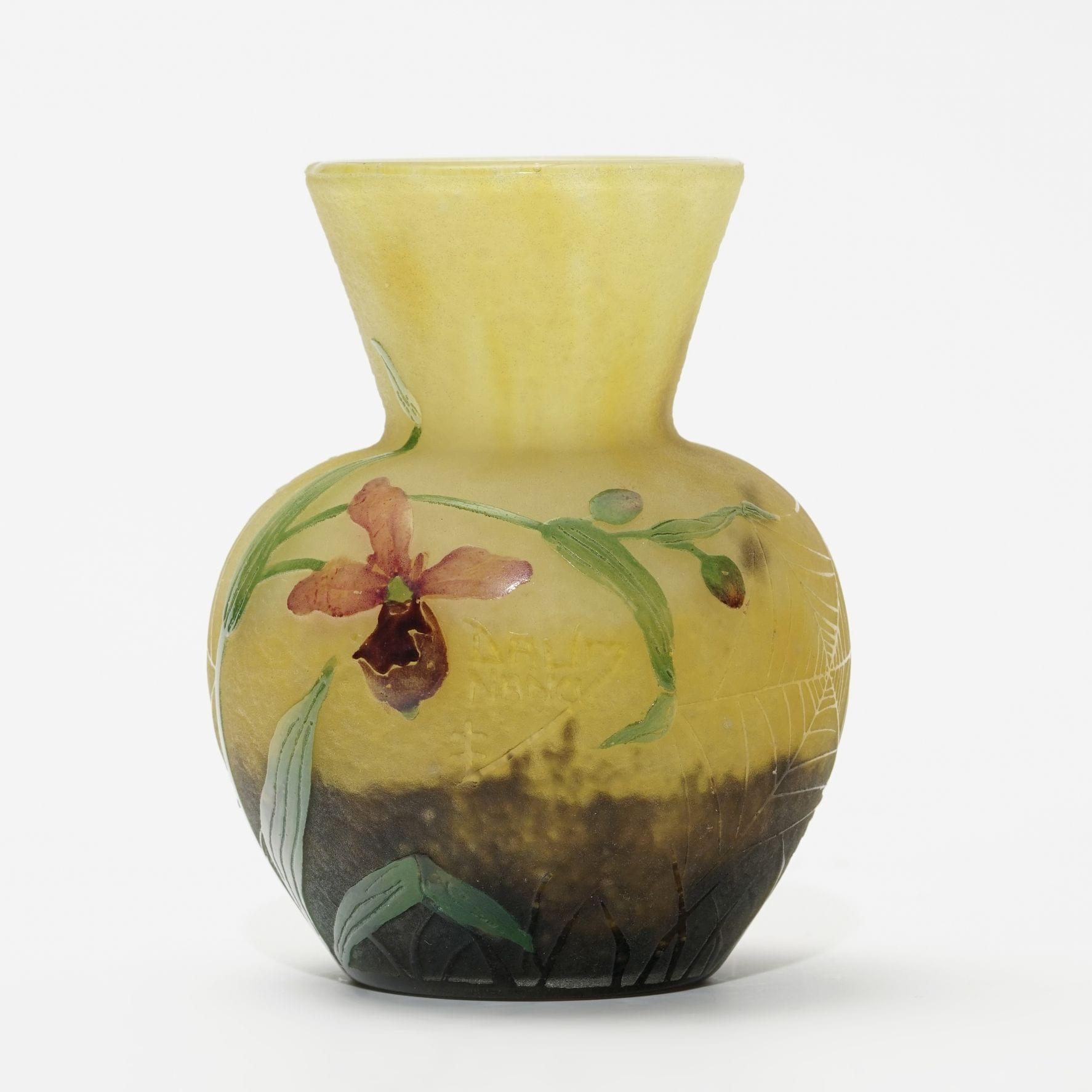 Verre marbré jaune et violet à décor peint de fleurs et sablé de toiles d'araignées, H 8 cm