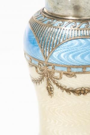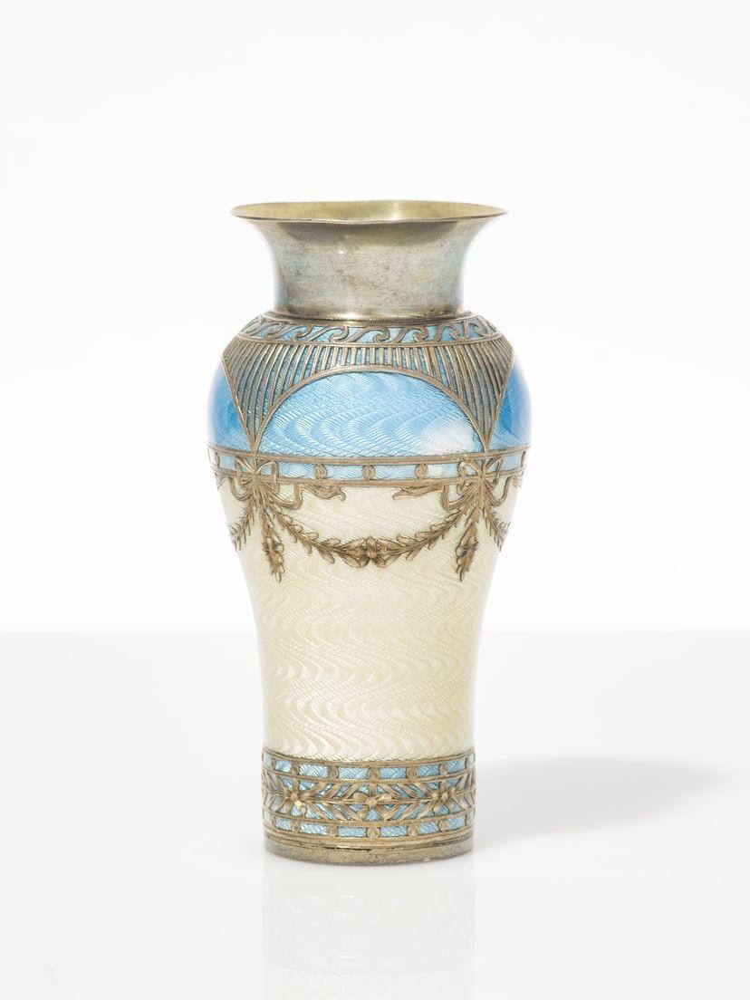 3195. Petit vase balustre à décor de guirlandes sur fond guilloché émaillé bleu et blanc