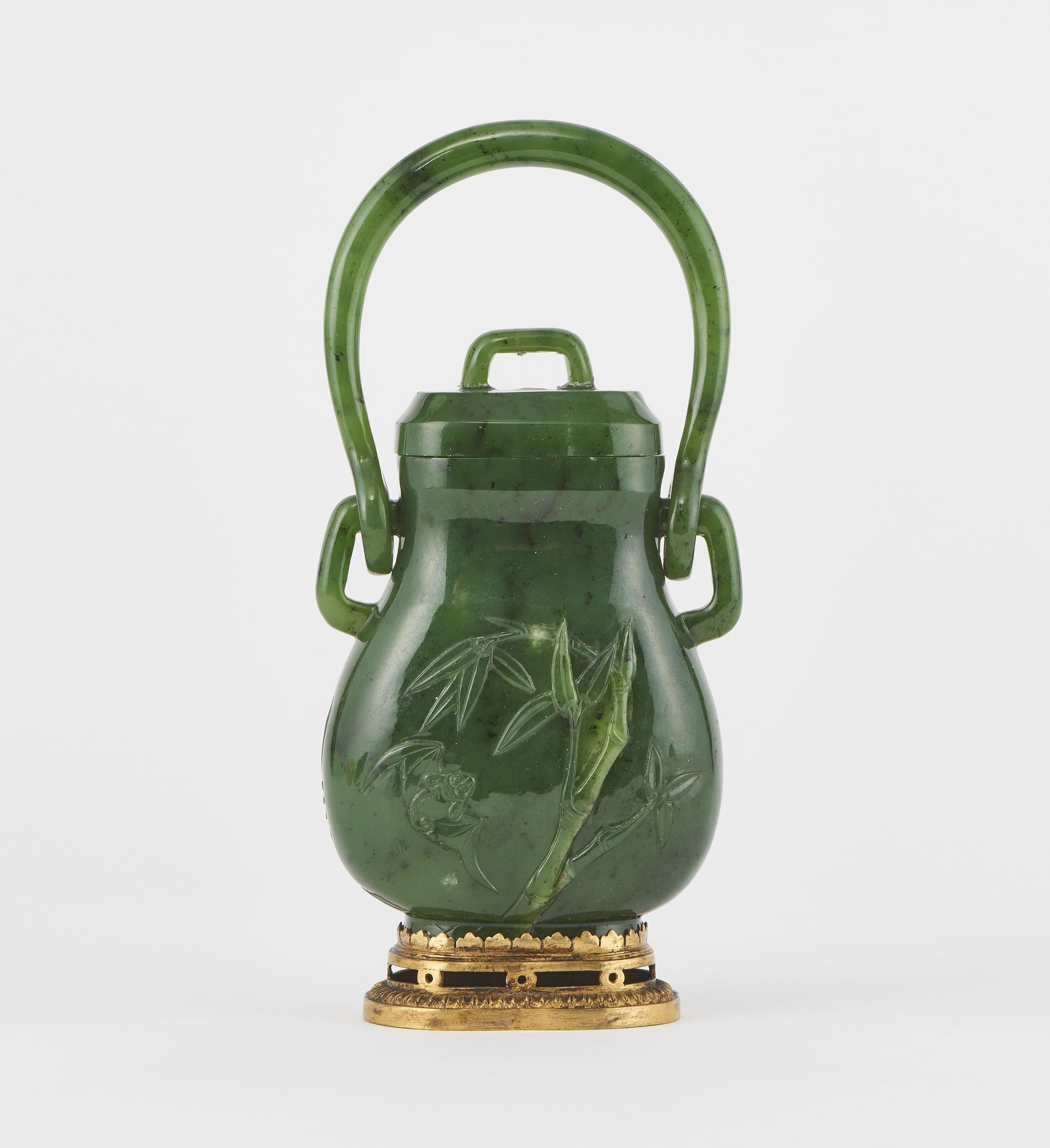 Jade épinard à motifs sculptés en léger relief de bambous et chauve-souris, monture en bronze doré signée L'escalier de Cristal, H 14 cm