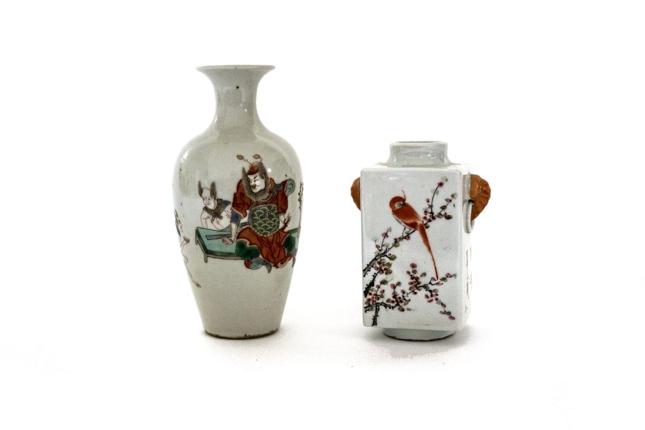 Porcelaine émaillée polychrome à décor de personnages et calligraphie, H 13 et 18 cm