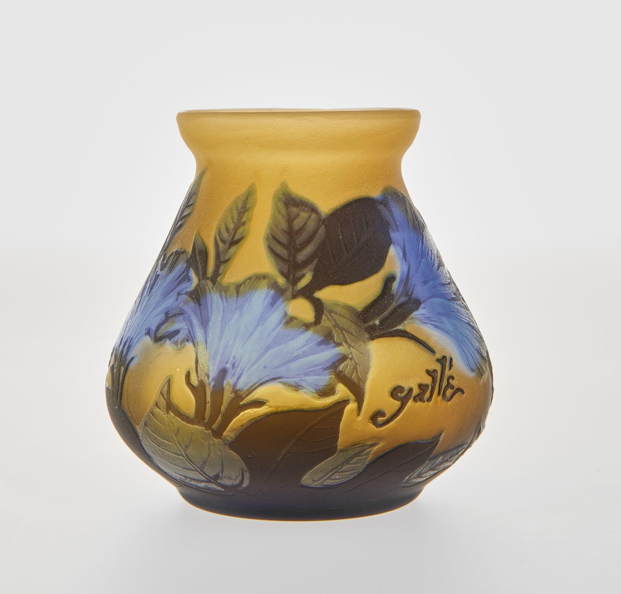 Verre multicouche dégagé à l'acide à décor de fleurs bleues sur fond orange, H 7 cm