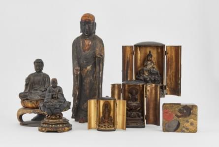 Bois fruitier à décor peint d'une ville surréaliste, porte un mo...