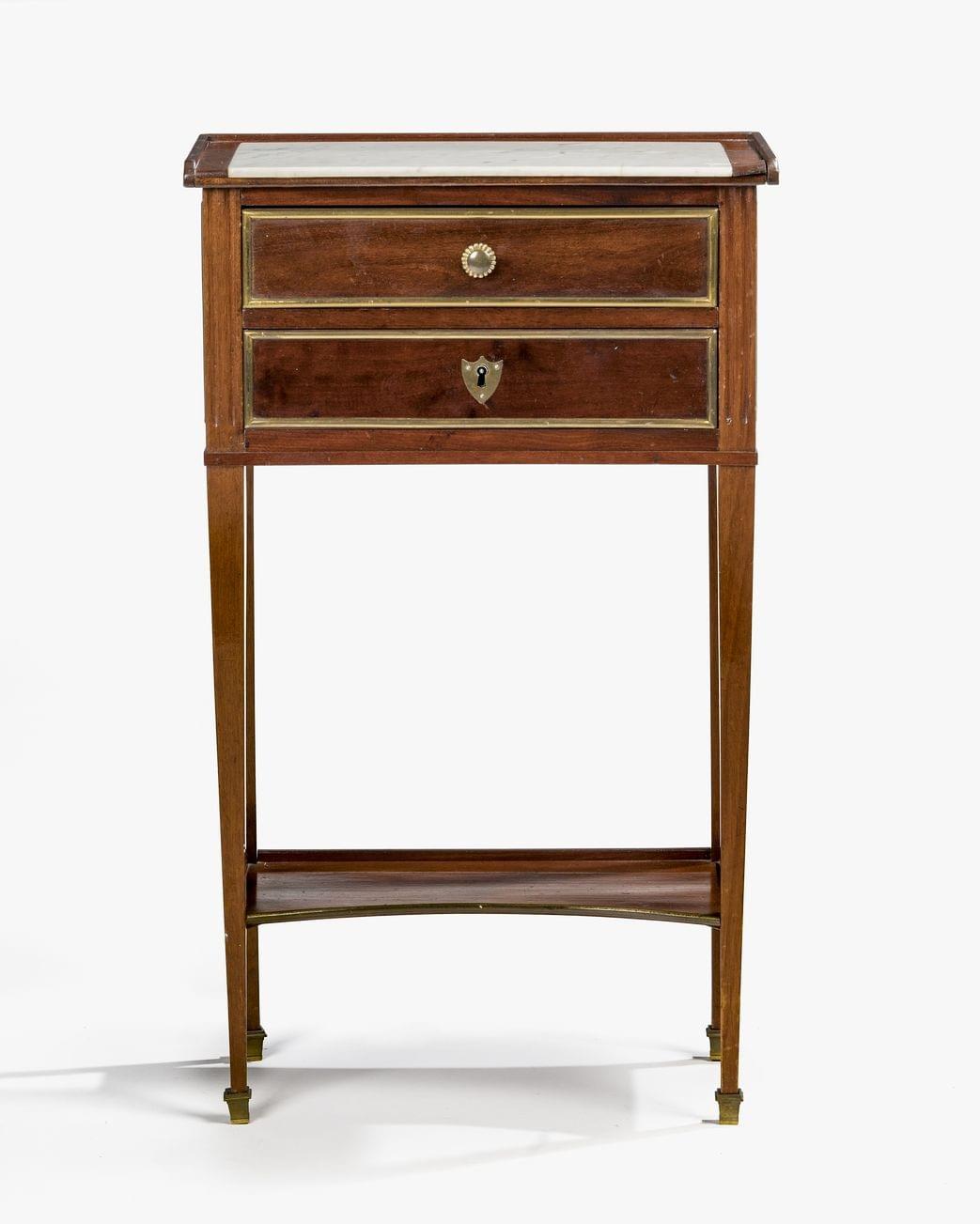 Deux tiroirs, acajou, filets de laiton et marbre blanc, 74x43x22 cm