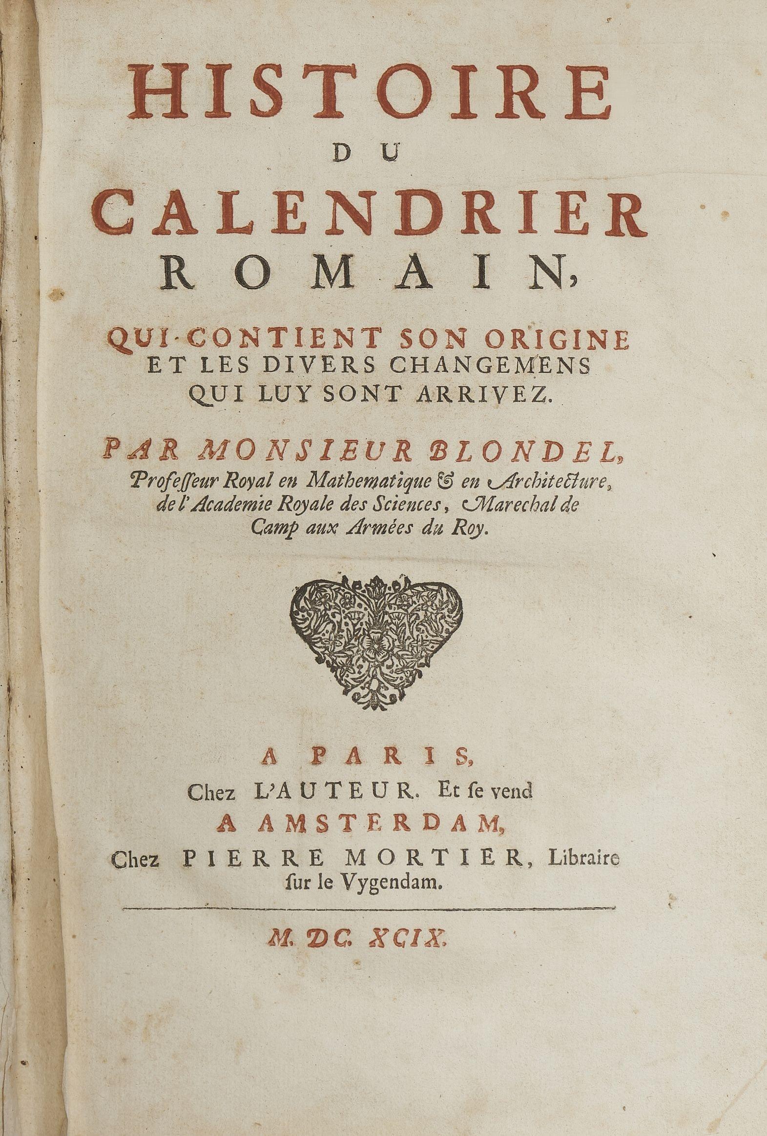 Défense de l’Antiquité des Tems ou l’on soutient la tradition des Pères et des Eglises contre celle du Talmud. Paris, Boudot, 1691 ; in 4°, veau fauve granité, dos à nerfs orné, tranches rouges. Reliure de l’époque. Ex libris mss sur le f. blanc et le titre. On joint : BLONDEL : Histoire du Calendrier Romain. Paris et Amst., 1699 ; in 4°, veau orné de l’époque.