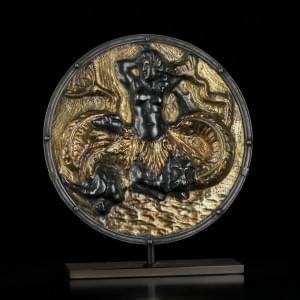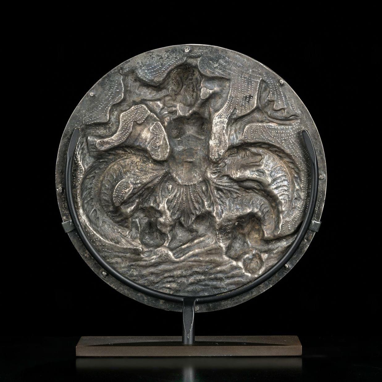 Argent et argent doré, D 16.9 cm, 170 g. Martelé à partir d'une unique feuille d'argent et travaillé au repoussé, le tondo est bordé d'une bague réalisée à part et fixée par huit rivets. La bichromie est obtenue par une dorure appliquée sur le fond ainsi que sur la jupe en feuilles d'acanthes et les queues du monstre marin. Ce dernier est figuré dressé, le torse nu, tenant dans ses mains un gouvernail de navire. Trois chiens émergent de sa jupe en feuilles d'acanthes et tiennent dans leurs gueules et leurs pattes les corps de deux marins. Du fait de sa taille imposante, on imagine d'avantage notre exemplaire utilisé pour décorer un meuble ou un objet important que pour orner le couvercle d'un miroir ou l'ombilic d'un plat. Provenance: Collection privée suisse