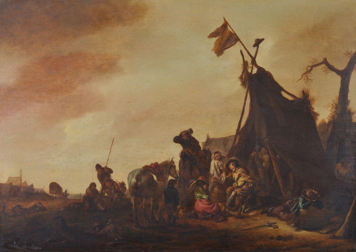 Campement avec vivandières et militaires, huile sur panneau, 56x78 cm, étiquette au dos : ancienne collection V. Dongen no 35. Un certificat daté de novembre 1934 et signé du professeur Gustav Gluck, directeur du Kunsthistorisches Museum de Vienne de 1911 à 1931 accompagne cette œuvre. Il authentifie ce tableau comme étant celui vendu le 7 juin 1774 et provenant de la collection du bourgmestre d'Anvers, M. van Schorel, seigneur de Wilbryck, vendu encore une fois le 18 août 1807 (ancienne collection F.E. de Estborn)