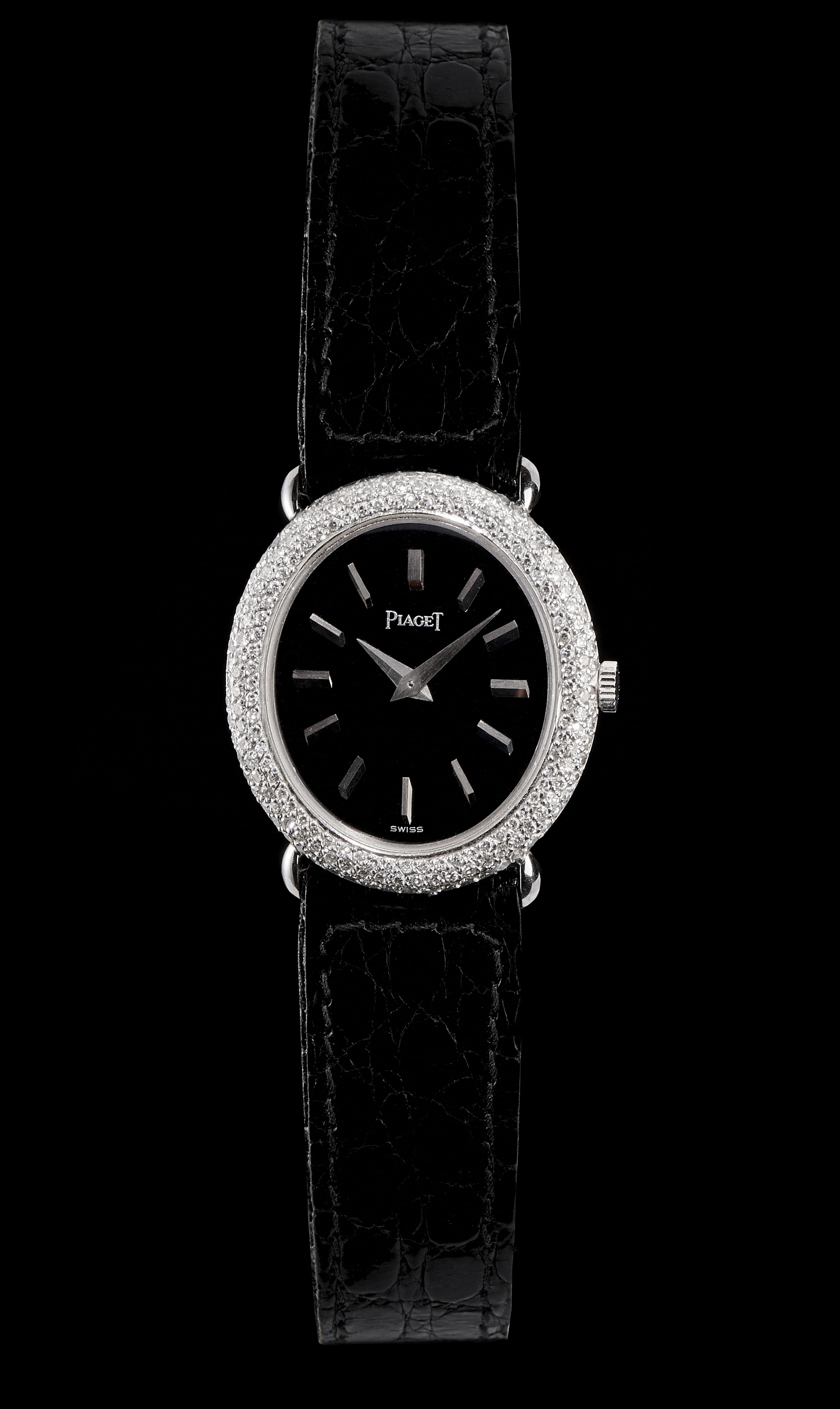 Cadran noir, index bâtons et aiguilles argentés, or gris 750, 27x24 mm, poids brut 29 g