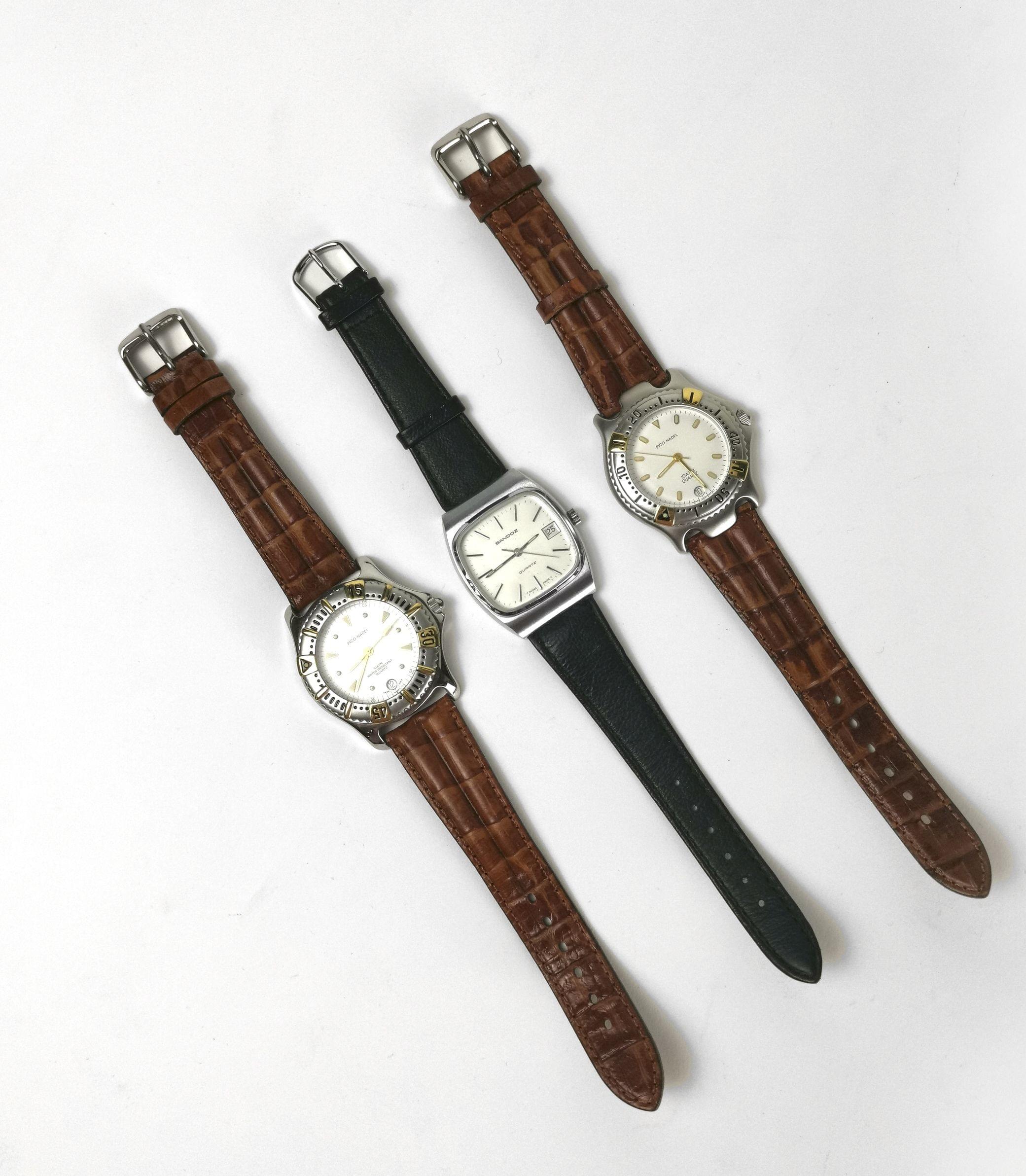 Cadran blanc, aiguilles et index luminescents dorés, date à guichet à 6h, acier et métal doré, D 32 mm. On joint une montre rectangulaire à quartz signée Sandoz, cadran gris, aiguilles et index bâtons argentés, date à guichet à 3h, 27x30 mm