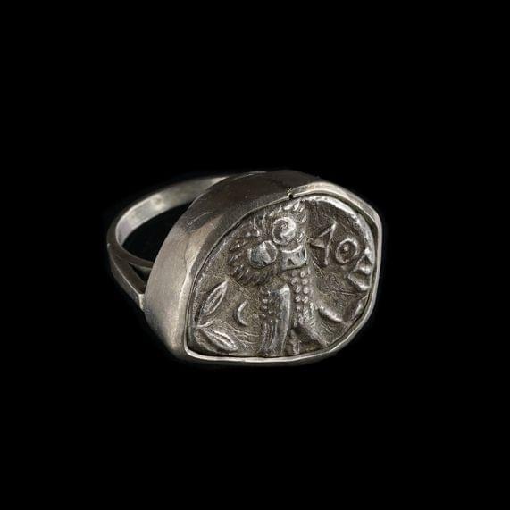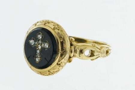 3054. Bague chevalière ronde sertie d'une plaque d'onyx à motif de cro...