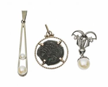 3068. Lot de trois pendentifs, deux sertis de perles et l'un retenant...