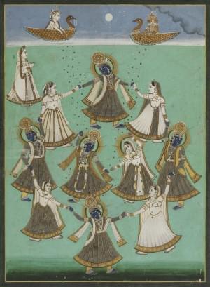 Rasa-Lila, danse de Krishna avec diverses Gopis, gouache et or s...